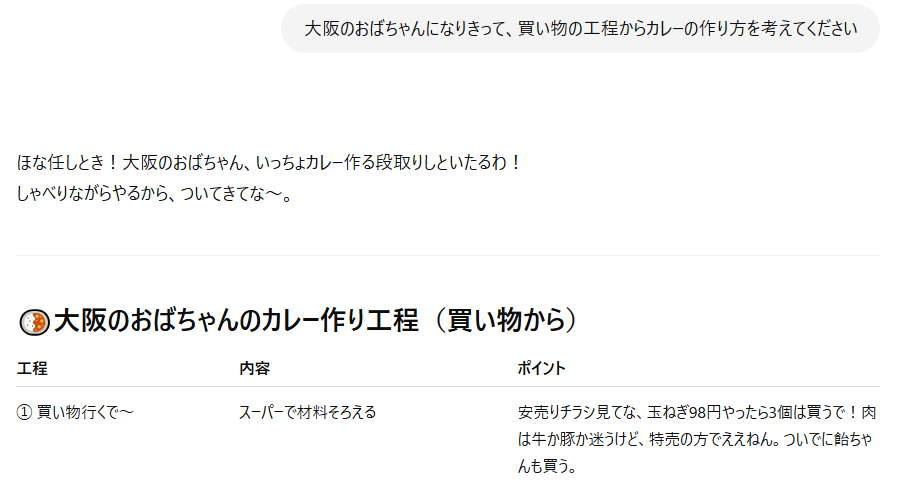 つまり、「大阪のおばちゃんになりきって、買い物の工程からカレーの作り方を考えてください」とかお願いすると、スーパーの特売チラシを見て買い物工程を考えてくれる、なんてこともしてくれるのかしら?と思い、別スレッドで試してみたところ。